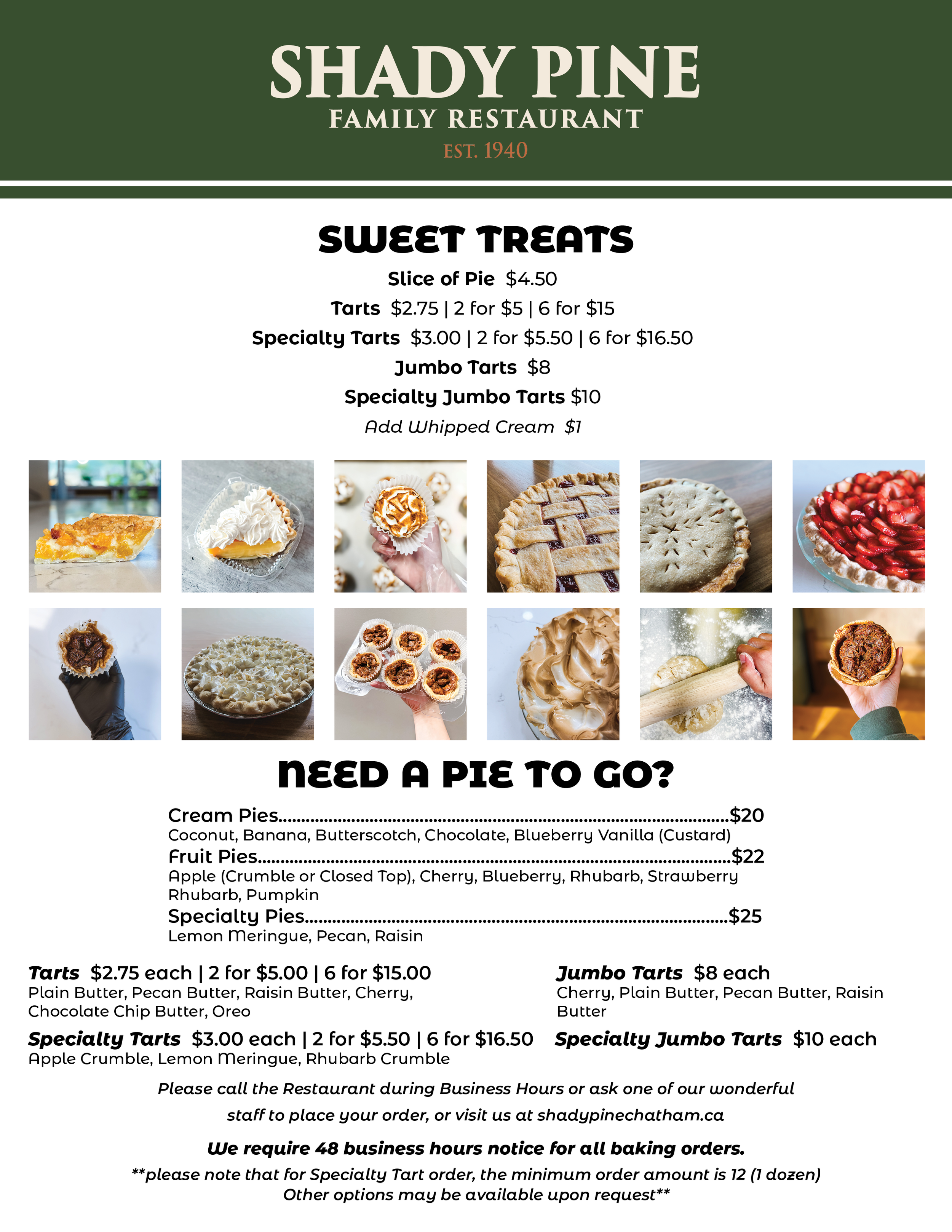Apple (crumble or closed top), Rhubarb Crumble, Cherry, Blueberry, Strawberry Rhubarb Crumble, Pumpkin